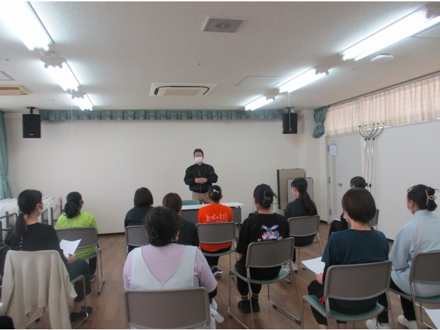 本日は、東海警察署生活安全課の稲田氏より「不審者対応について」実践を含めた講義があり、参加者全員がさすまたを持って相手の動きを止める難しさを体験しました。