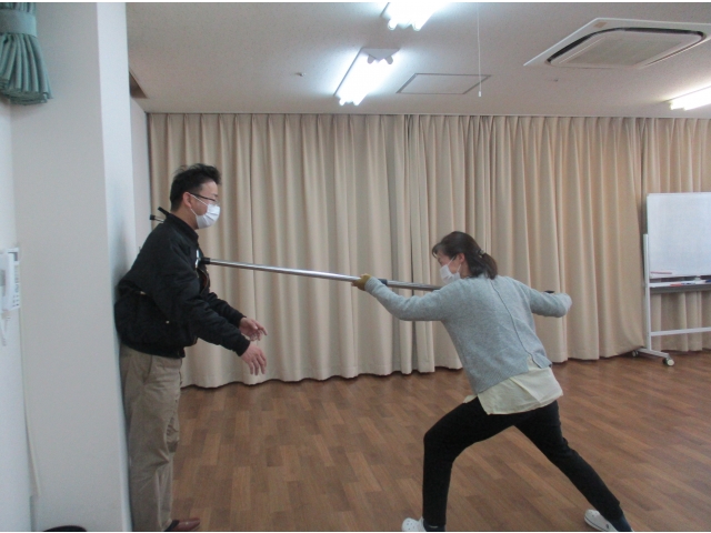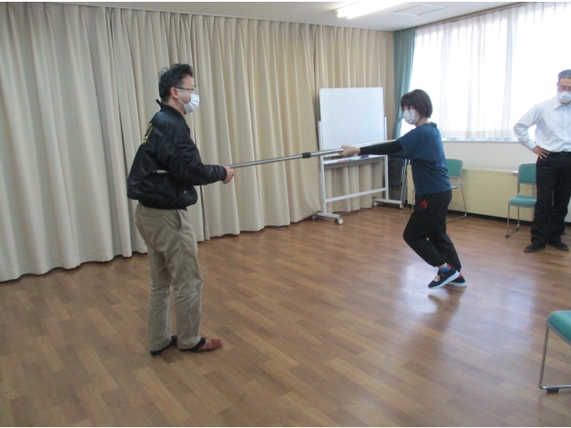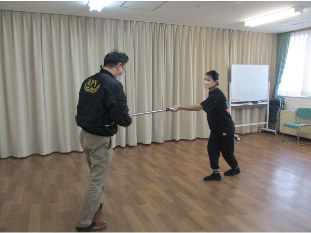 さすまたの使い方では、相手の動きを止めるだけでなく、まず相手との距離を作るためにさすまたを反対に持ったり、振り回すなど動かし続ける、3人以上で対応するなどの具体例を実演していただき、一人で対応しない、情報共有する、110番通報するなどの対応のポイントを教えていただきました。