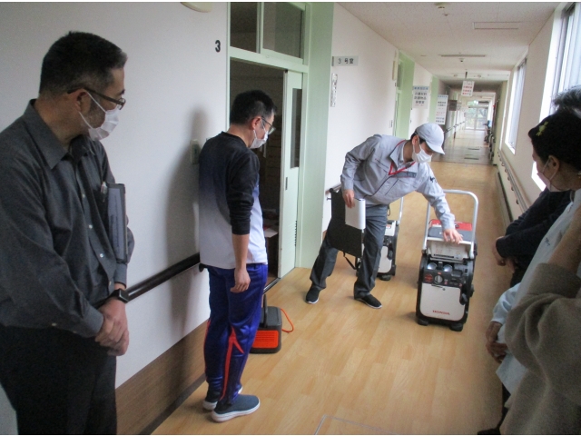 西1棟に保管している自家発電装置を、アサヒファシリティーズの職員が講師となり、使用方法や手順、注意点などの説明がありました。