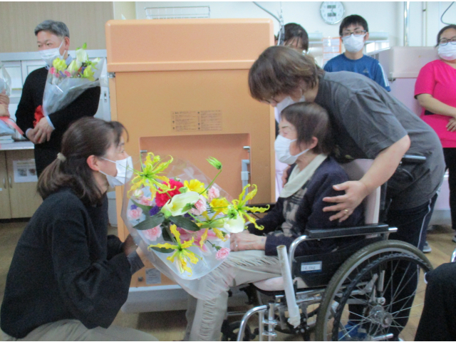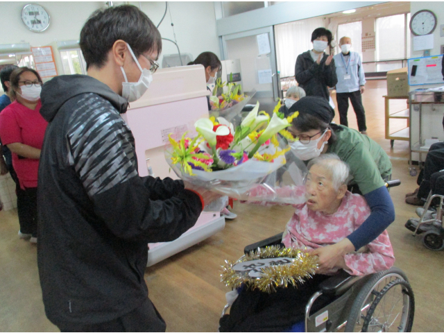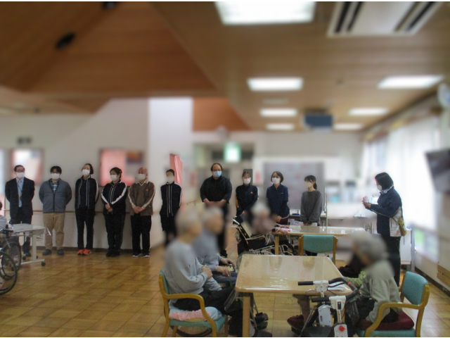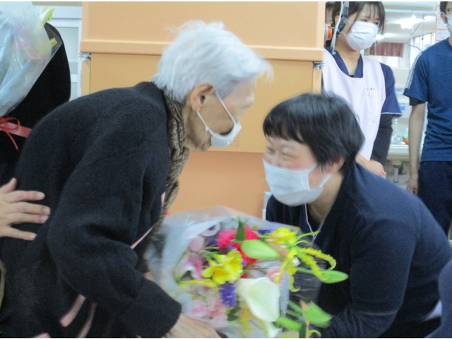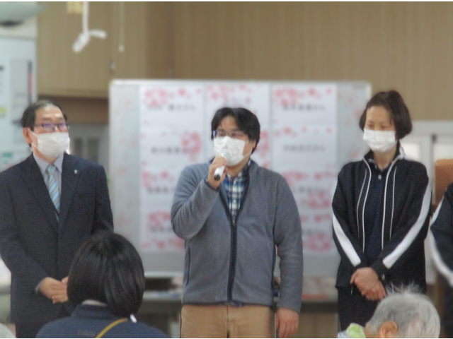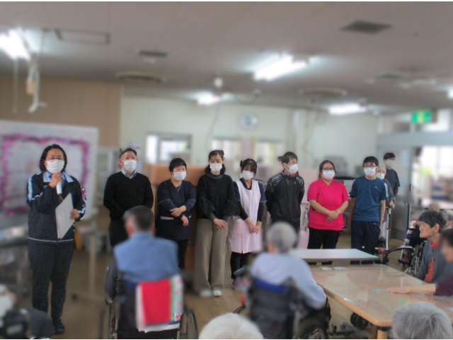 3月31日には7名の職員の方の異動に伴い、挨拶と花束贈呈が行われました。その際には大府苑での時間が長い方も短い方も、利用者様と過ごしたかけがえのない時間を振り返られ、それぞれの別れの挨拶をしていただきました。