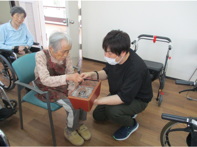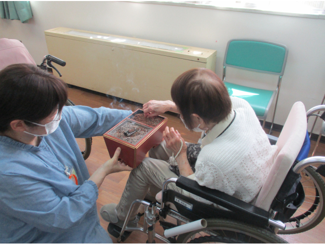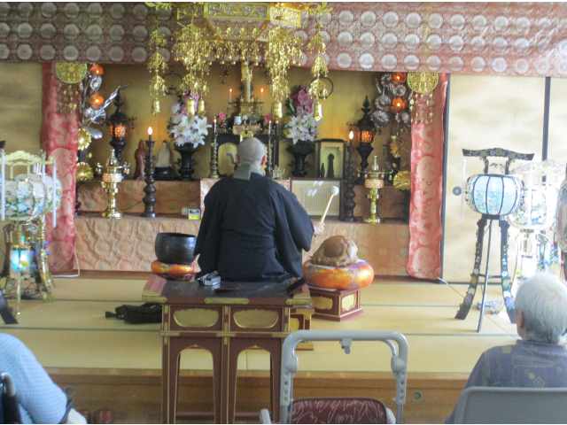 5月20日(火)10時から、大府市にある賢聖院のご住職をお招きして、5月の月例祭を行いました。 お経をあげていただき、職員・ご利用者様が順番にお焼香しました。 最後に、昨今の米価格の高騰にも触れながら、ご住職が身に着けているお袈裟について、いろいろな方からいただいた布を縫い合わせているものもあり、非常にありがたいもので、ご利益がありますようにというありがたいお言葉をいただきました。
