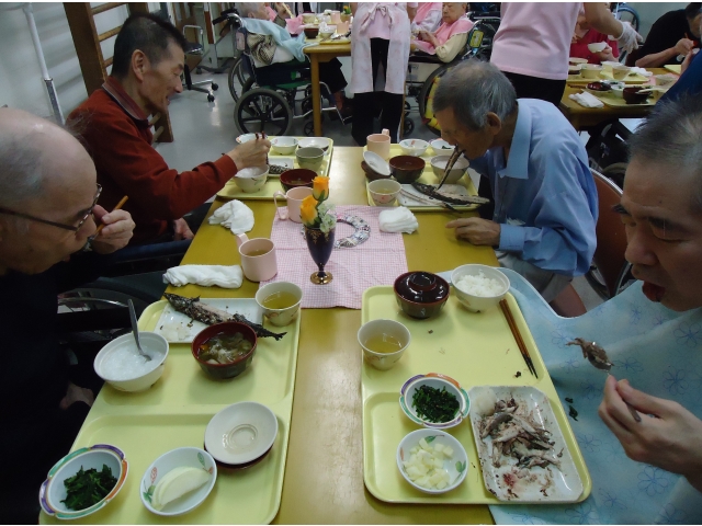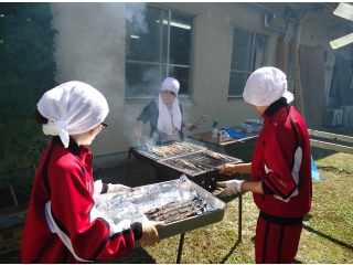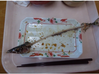 栄養士さん、実習生のお二人が皆さんのために一生懸命100匹も焼いてくれましたー。