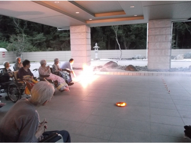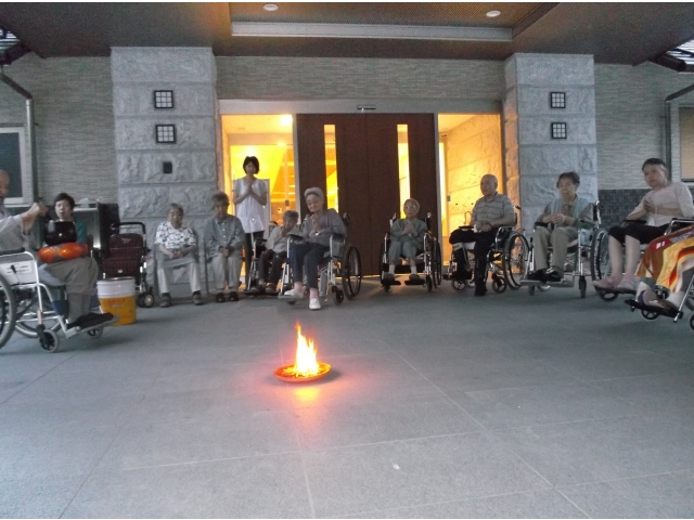 毎年、入居者のみなさんと玄関で行います。松明をたきながら