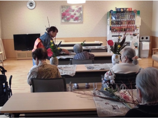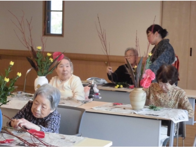 入居者の皆さん、真剣なまなざしでお花と向き合っています。
