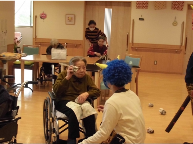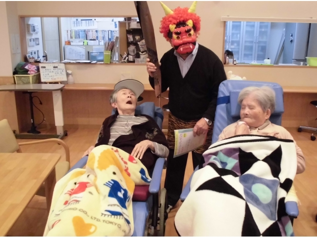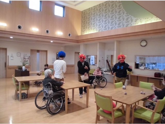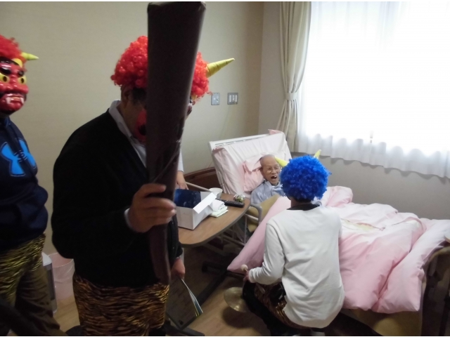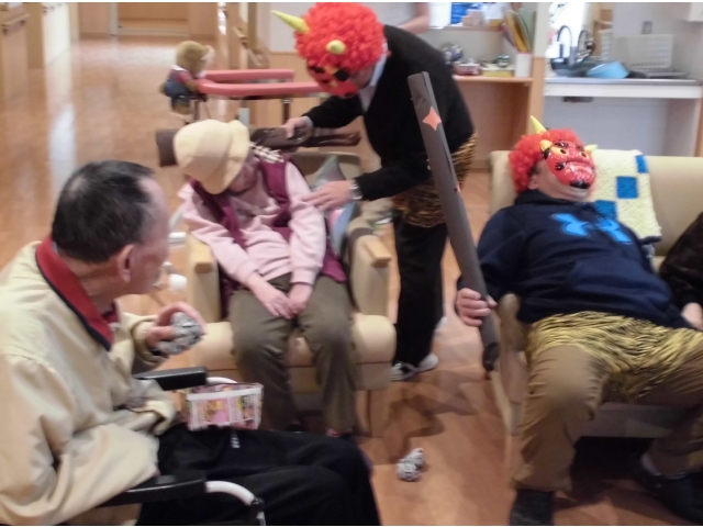 だんだんと豆を投げるというより、鬼にぶつけることに夢中に…「やっ、やられた~」鬼も大変です。豆を投げる入居者はとてもいい笑顔です。これからも元気にすごせますように。 愛厚ホーム 岡崎苑