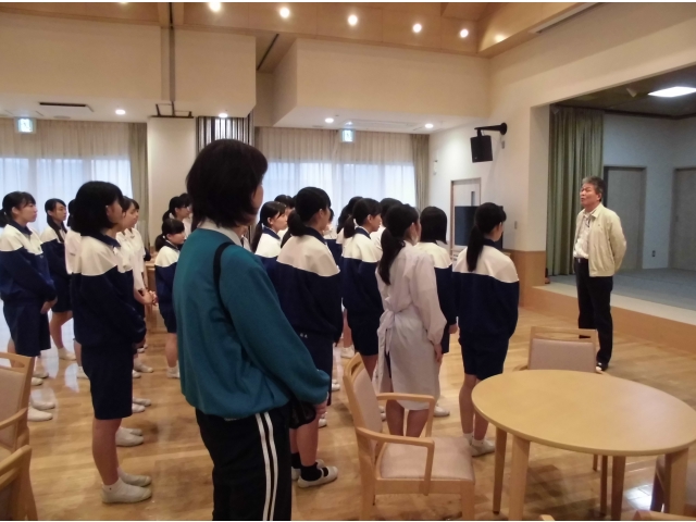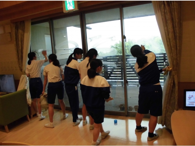 今回は、総勢34名の生徒の皆さんが愛厚ホーム岡崎苑に来ていただき、窓ふき清掃を中心として活動していただきました。