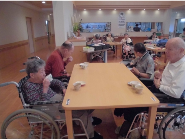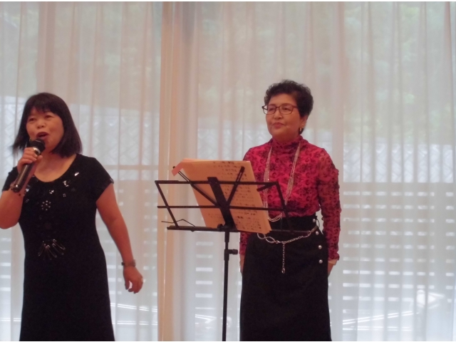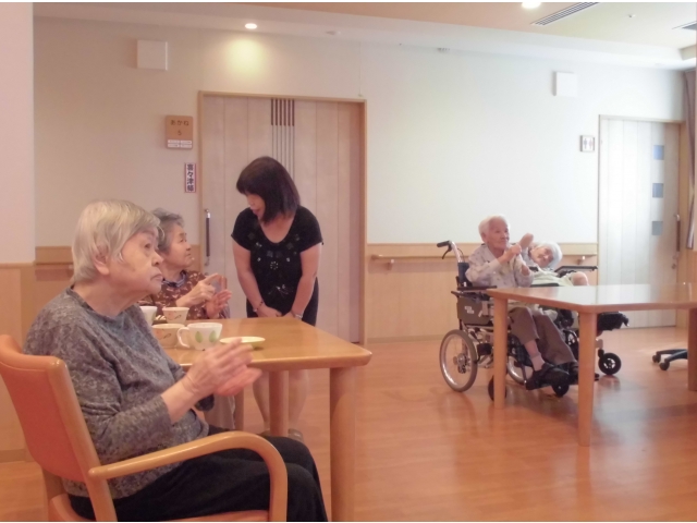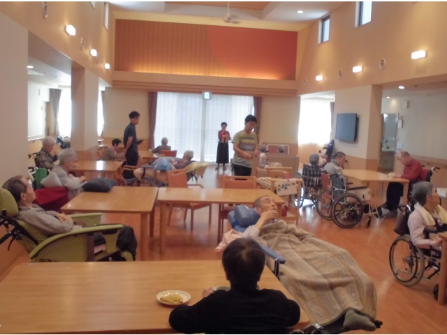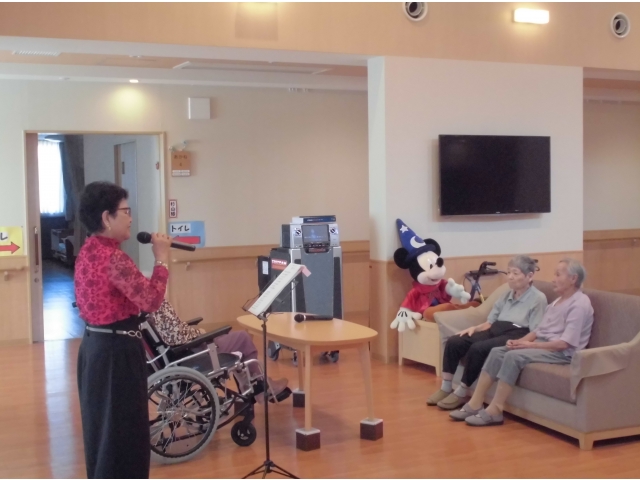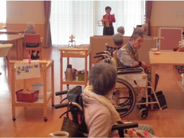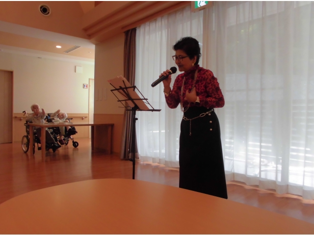 ♪愛の讃歌♪ブルーライトヨコハマ♪野に咲く花 他数曲を熱唱してくれました。心地よい歌声が響くフロアで入居者の皆さんはティータイム。いつものおやつの味もワンランクアップです豪華な豪華なおやつのBGMでした。モニカさんまた歌を歌いにきてくださいね!! 愛厚ホーム岡崎苑