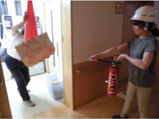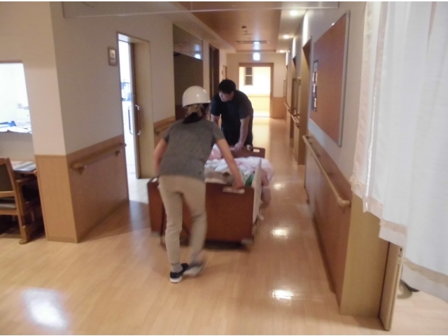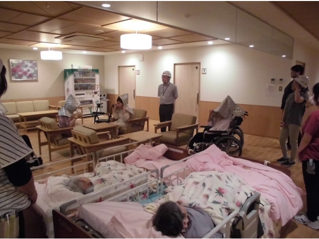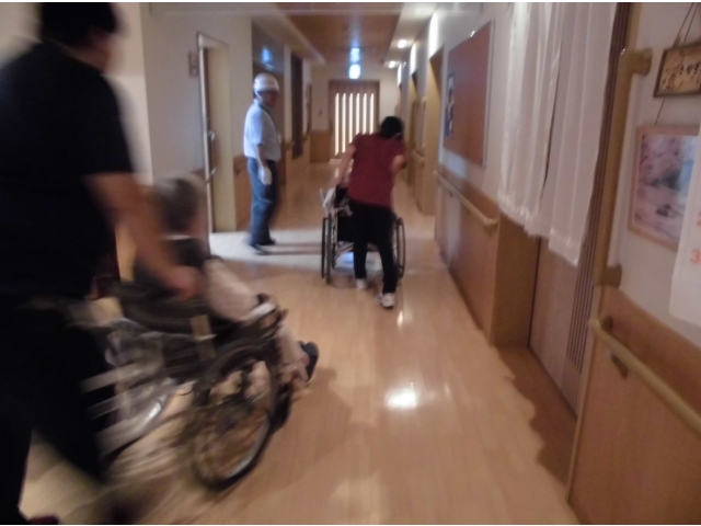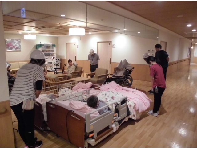 夜間帯は日中に比べ職員の人数も少なくなります。 そんな時に火災が発生した場合は、職員一人の役割は増えるとともに、いかに迅速かつ的確に行動できるかによって、入居者の安全と被害軽減が図れるかが変わってきます。 岡崎苑では、常にさまざまな状況を想定し訓練を行っています。