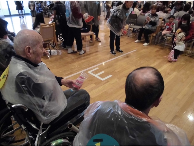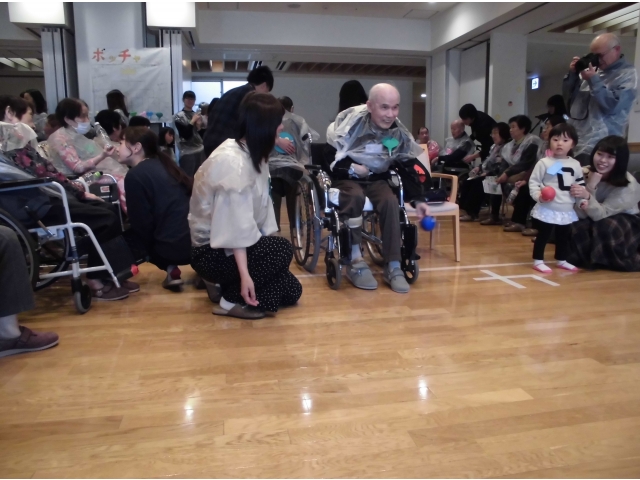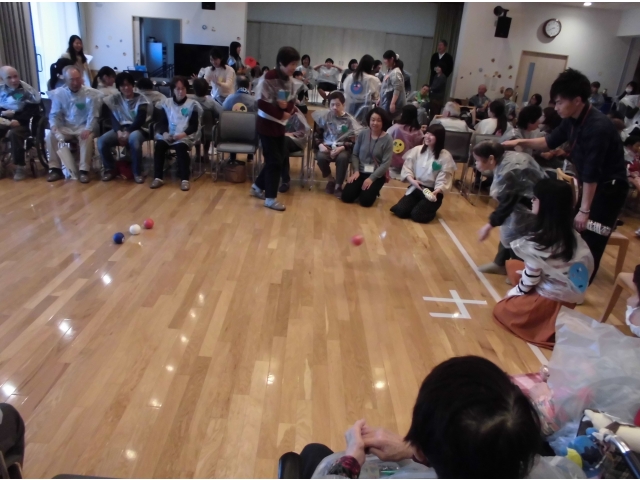 地域の人、岡崎苑の入居者、学生と総勢約130名がごちゃまぜで8つのチームに分かれて「ボッチャ」を楽しみました。
