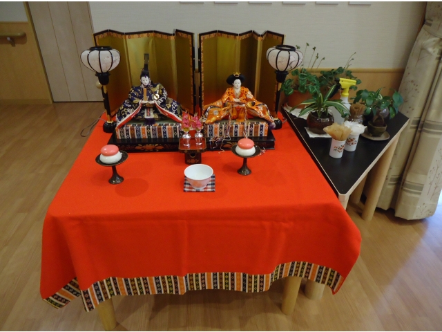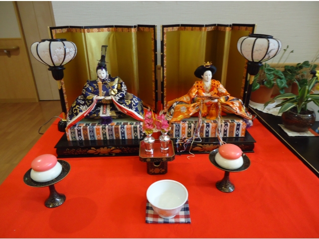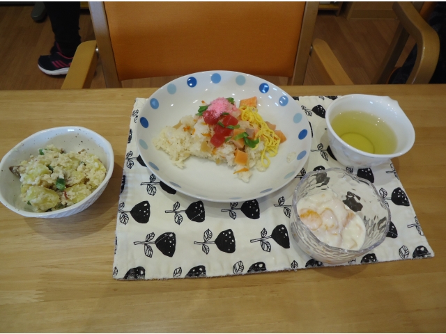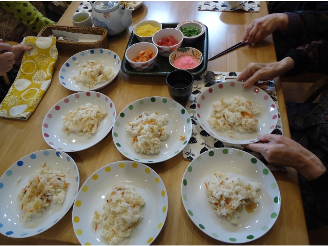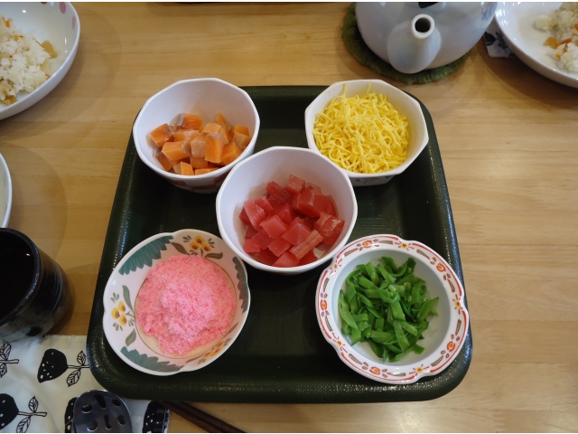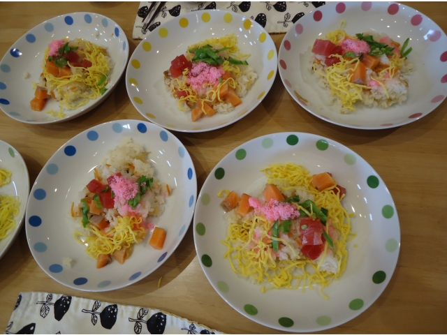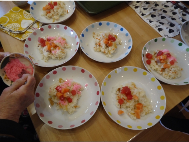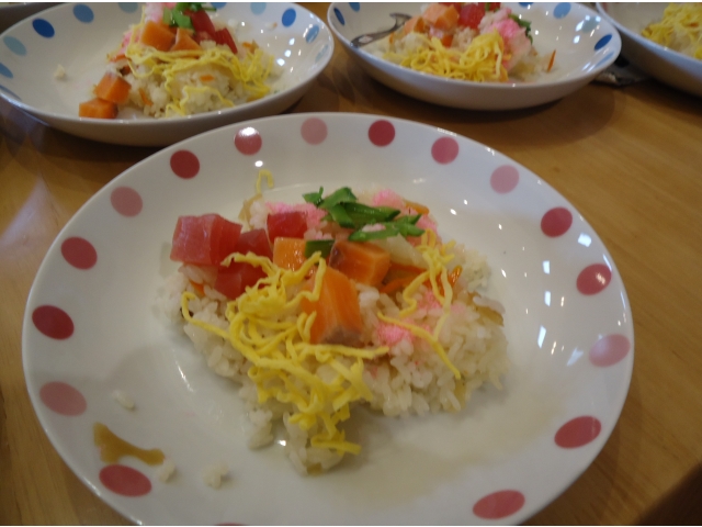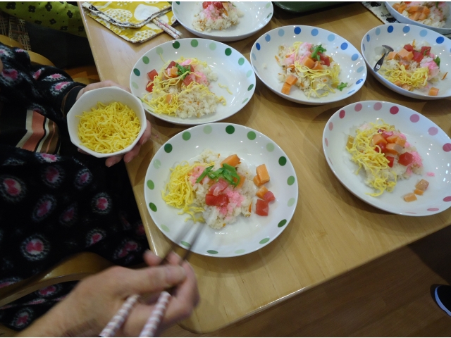 お雛様を飾り付けたら、ひなまつりの始まりです。 今日のお昼ご飯は、ユニットのみんなでちらし寿司を作りました。す飯に、マグロ、サーモン、錦糸卵、田麩(デンブ)、絹さやを、みんなで「ちょっと多いかな?」「もう少し田麩(デンブ)をかけた方がいいかな?」など言いながらワイワイと飾り付けをし、色鮮やかなちらし寿司が完成しました。 みなさん揃って「いただきます」をして、お雛様の前で美味しく食べました。