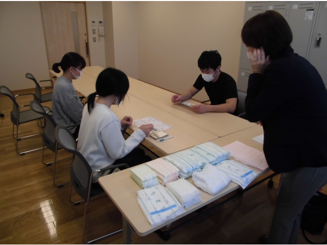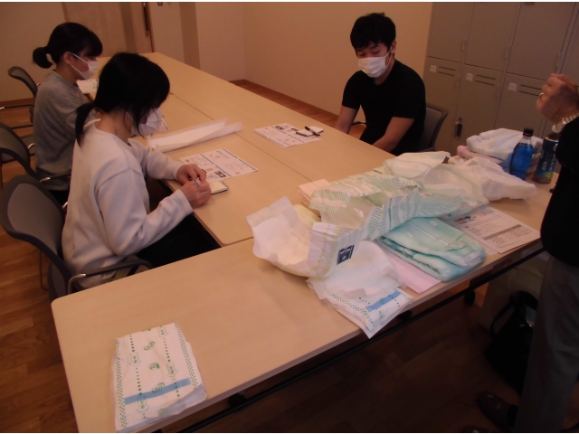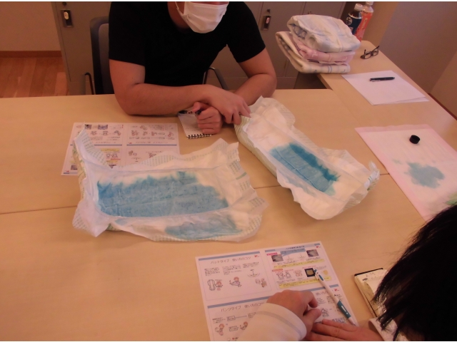おむつは、さまざまなメーカーと目的に応じた数多くの種類があり、個々の機能や使い方は違います。 正しいあて方が出来なければ、入居者の方へ不快な思いやストレスを与えることになってしまいます。 岡崎苑では、新しく入ってくれた職員の方にその都度、おむつの機能や正しいあて方の研修を行っています。 今回は3名の職員に、しっかり勉強してもらいました。