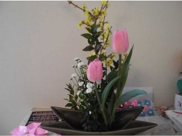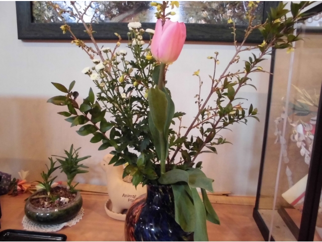 今回のお花にチューリップがありました。まだまだ朝・晩が冷え込みますが、春が近づいてきた感じがします。