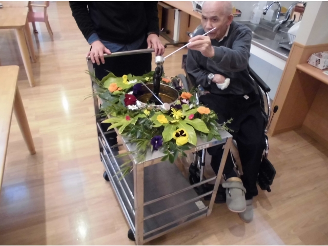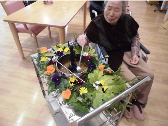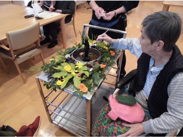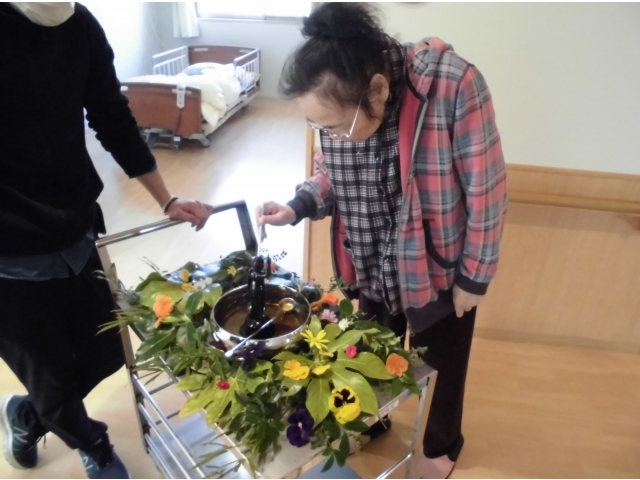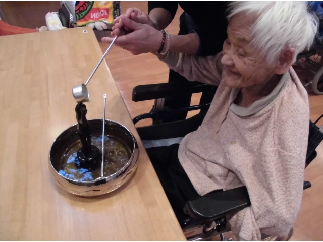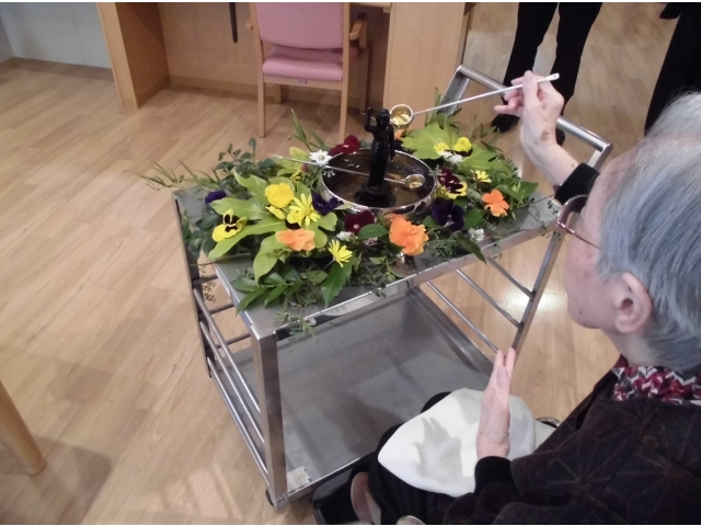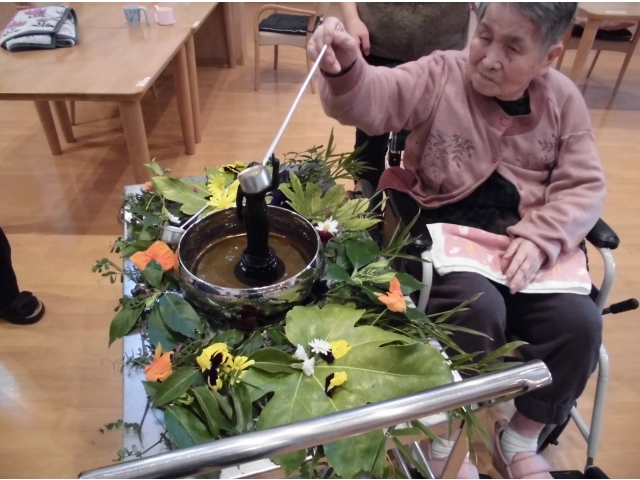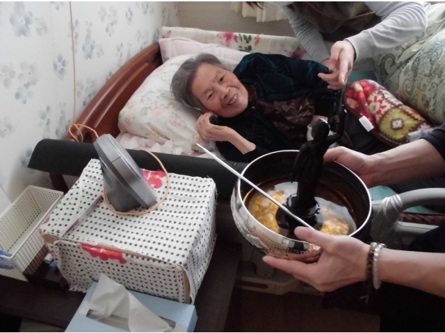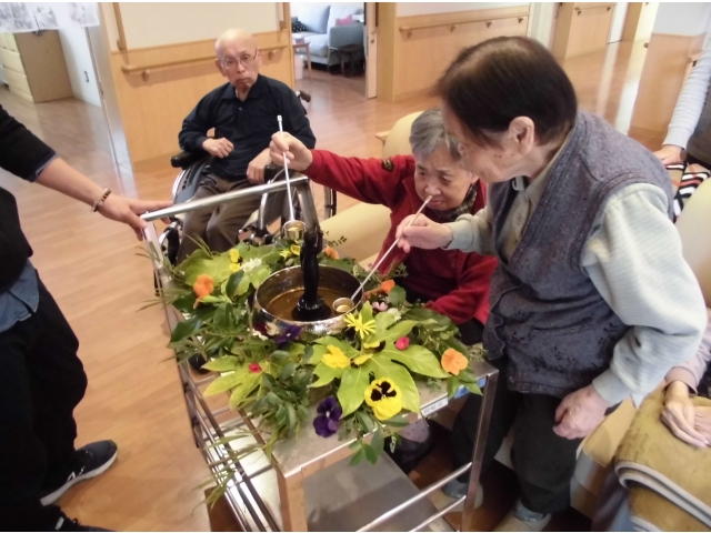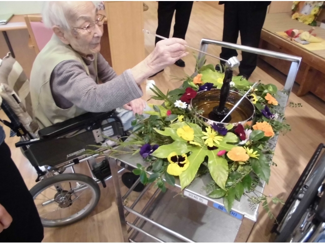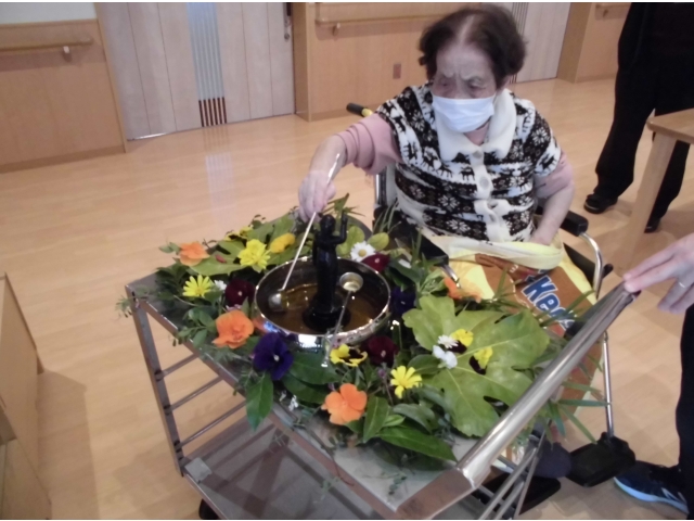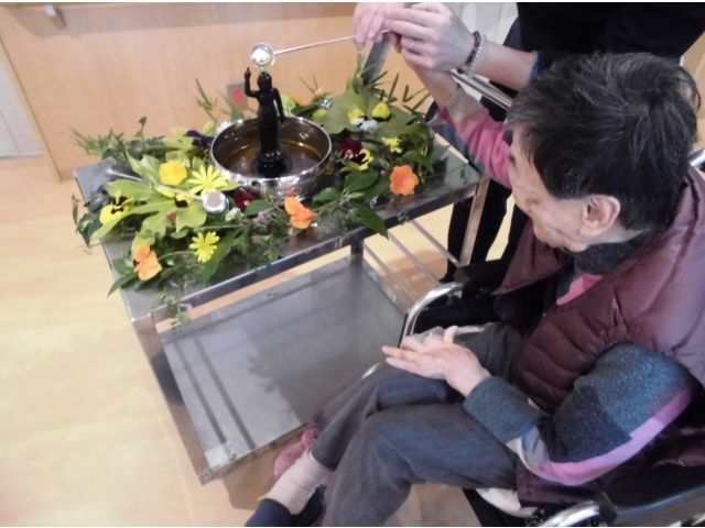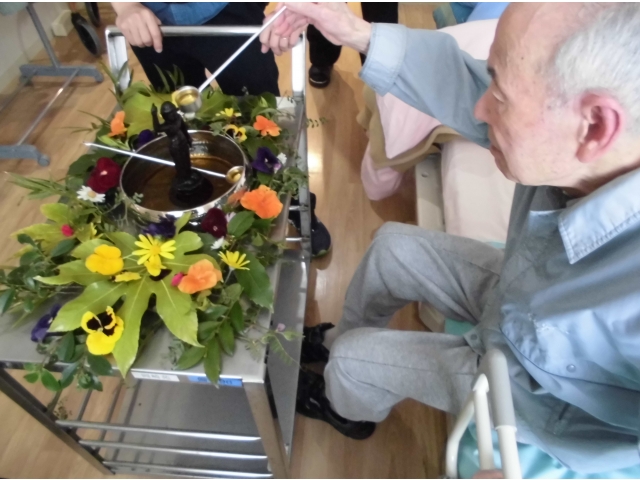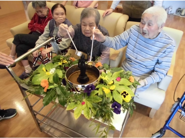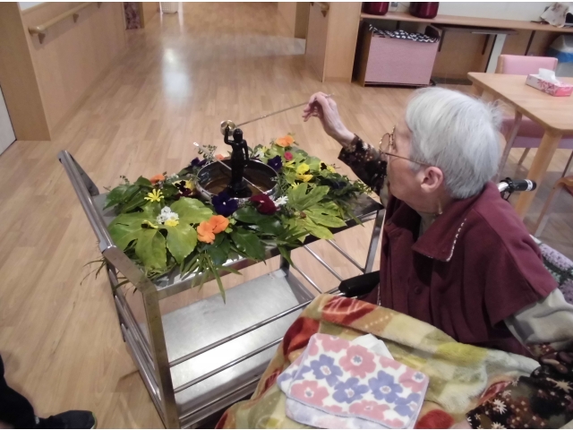 [足が痛いのが治りますように。」「私は腰が痛いので・・」と言いながら甘茶をかけている方もいました。