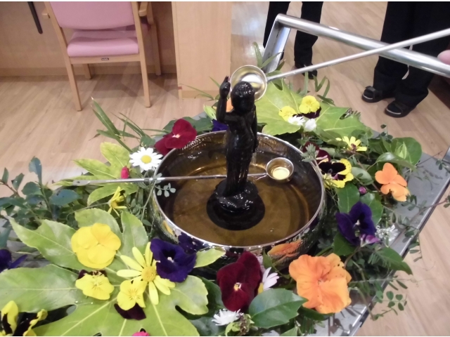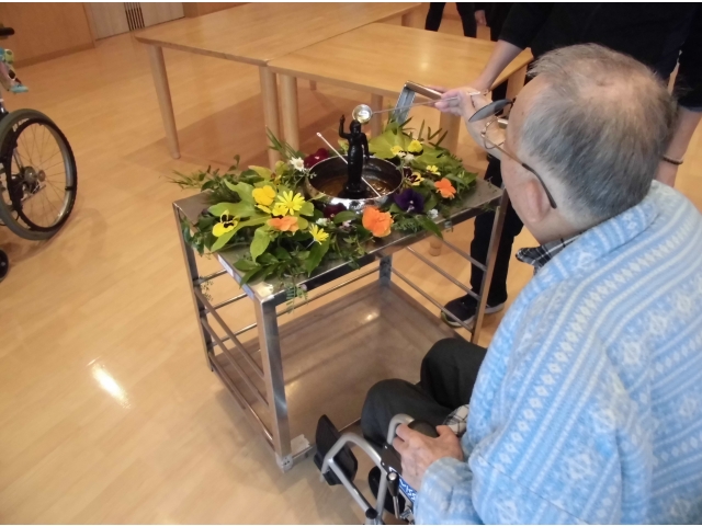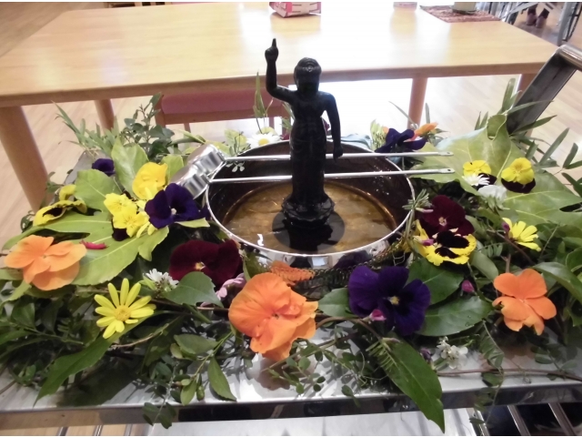 「花まつり」では、お釈迦様の像に甘茶をかけてお祝いします。