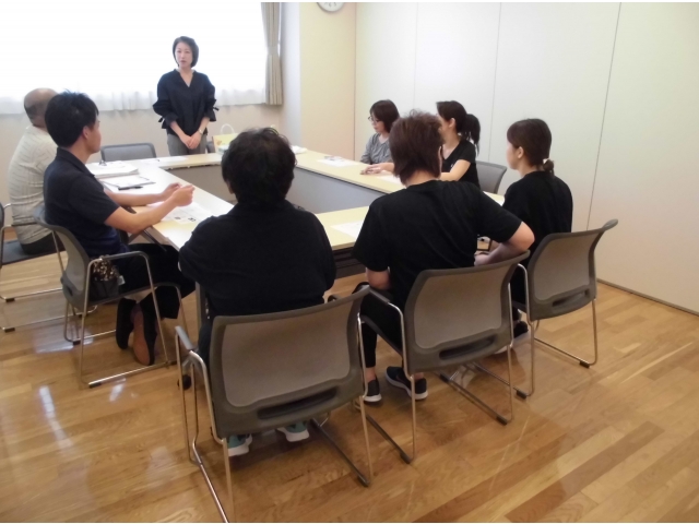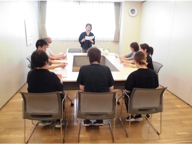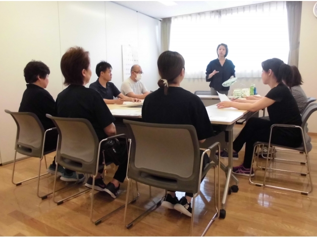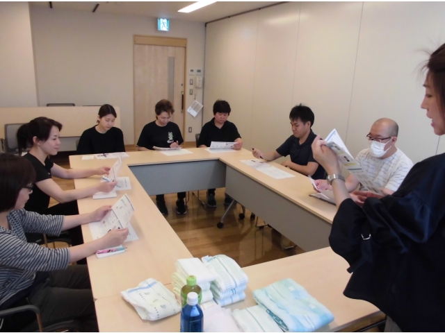 4月から転入してくれた職員の方へ、岡崎苑で使っているはくパンツ等12種類のおむつ類の機能性や使用方法についての研修を行いました。 今回は7名の職員に、機能性や使用方法について研修してもらいました。