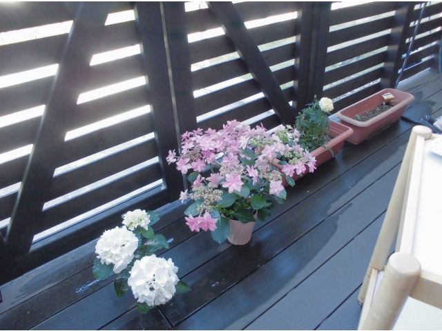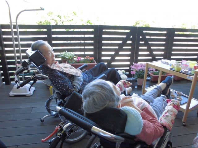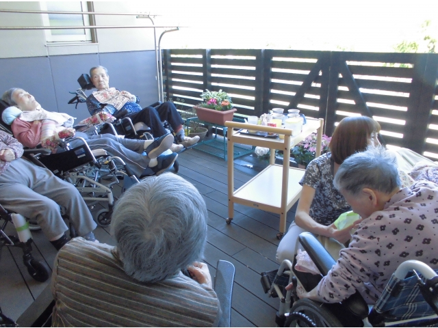 さわやかなある日の午後 もえぎユニットでは テラスでティータイムを楽しみました。暑すぎず、寒すぎず 今だけのお楽しみです。テラスからの風景も最高。いつものおやつとコーヒーもグレードアップ!!