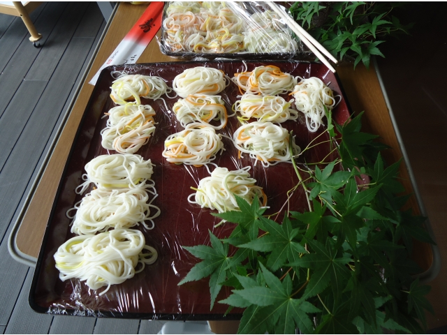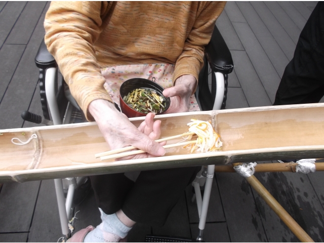 白、黄、橙、緑の色とりどりのそうめんを、水の流れる竹の樋に入れると、ゆっくりゆっくり気持ちよさそうに流れていく