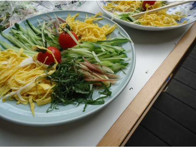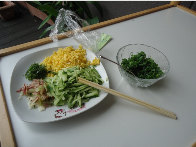 待ち構えていた箸ですくい取り、ネギ、ミョウガなどの薬味を入れたつゆに付けて食べました。