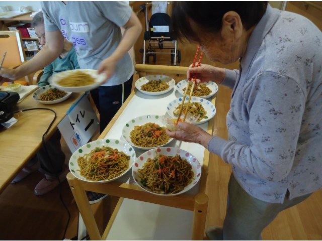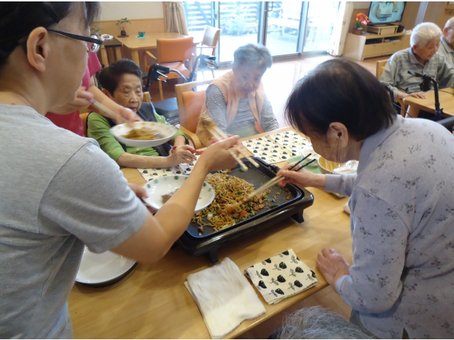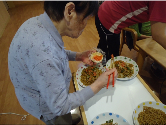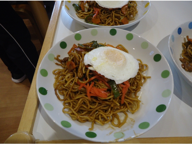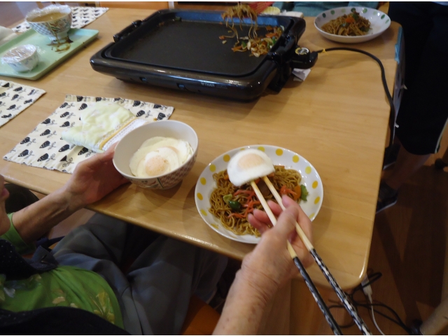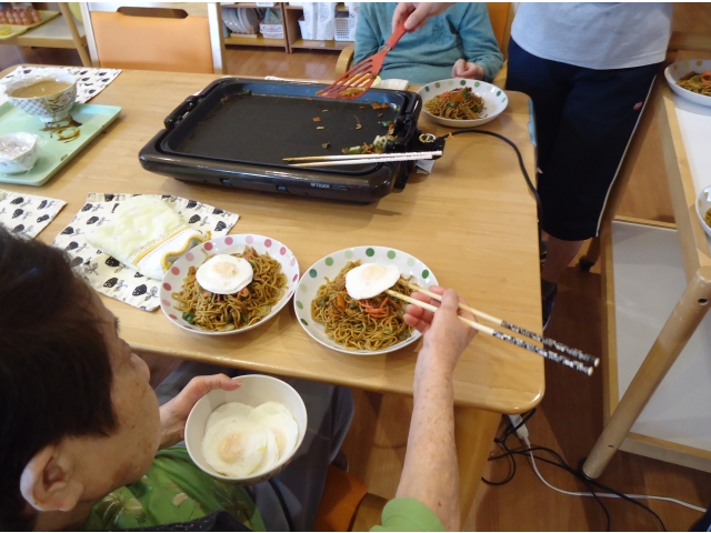 今日のお昼ご飯は、みんなでホットプレートを囲んで「焼きそばパーティー」です。 極上のソースを絡めた香ばしい麺が絶品 紅しょうが、青のり、目玉焼きをトッピングして「いっただきまーす!」