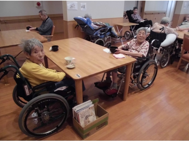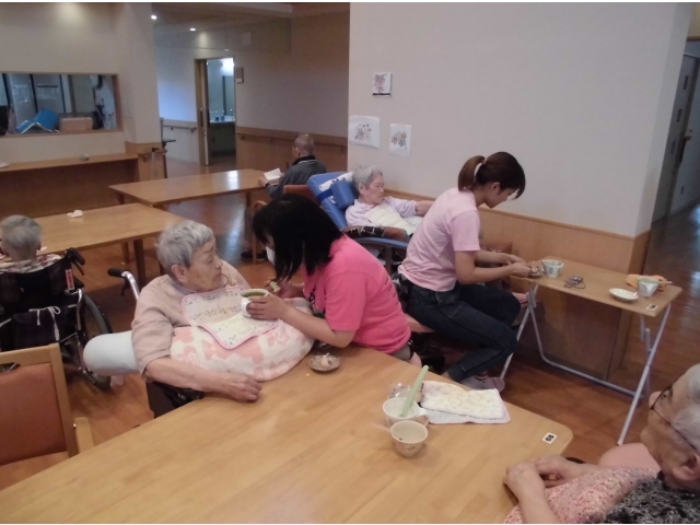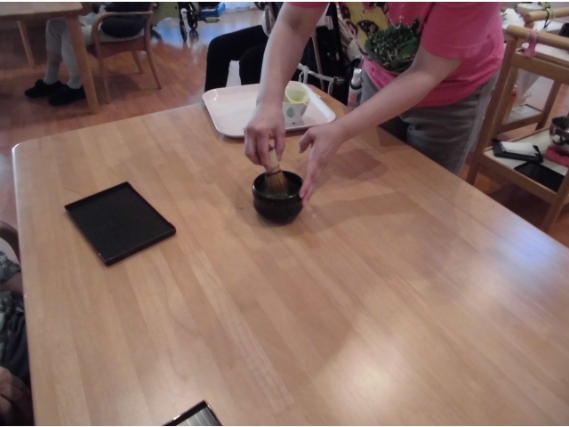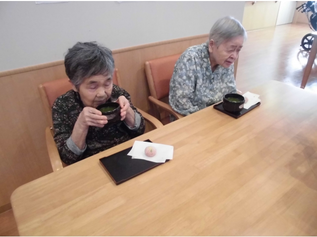 あかねフロアでは食事委員が中心となって毎月色々な企画をしています。今月は『抹茶会』目の前でお抹茶を立てて、和菓子を提供しました。見た目もきれいな和菓子。食べてもおいしい~。お琴の音色が流れ、本日のおやつはしっとりとした時間を過ごしました。 愛厚ホーム 岡崎苑