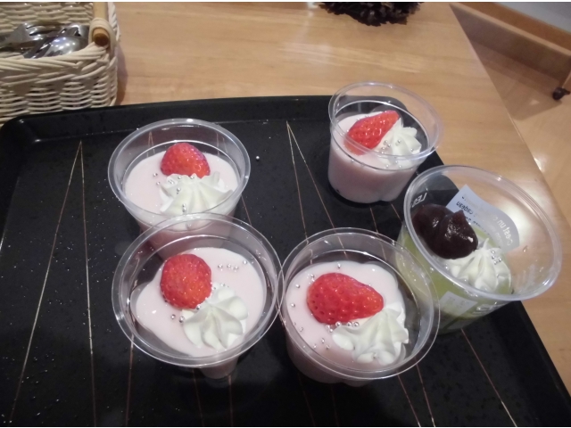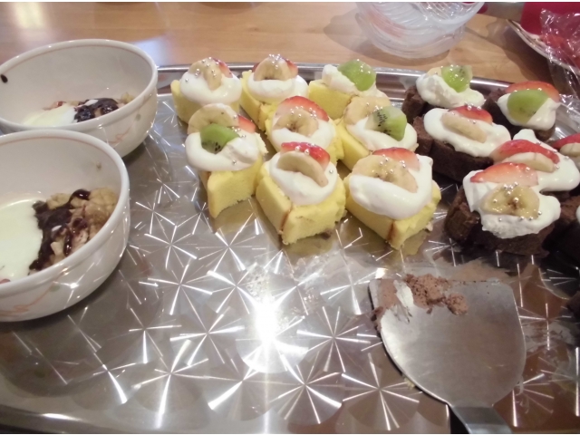 本日は一口ケーキとババロアです。市販の「ロールちゃん」にクリームとフルーツをデコレーション。家でもやってみよう♬