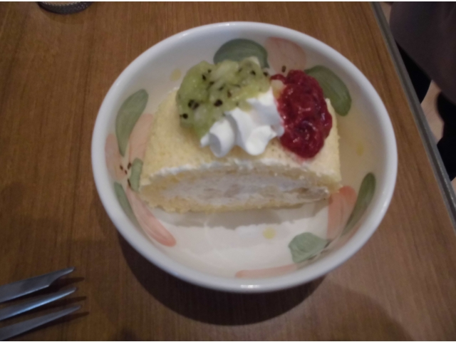 職員手作りのロールケーキにイチゴジャムとキウイを乗せて