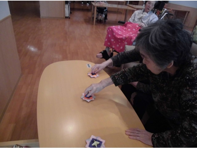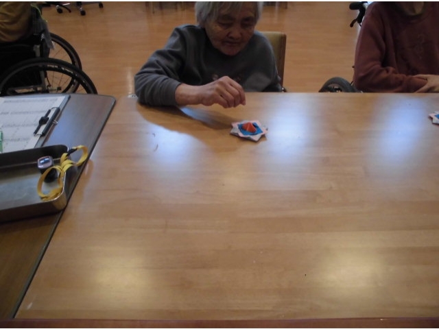 今日、折り紙クラブの先生が折り紙で折ったコマを