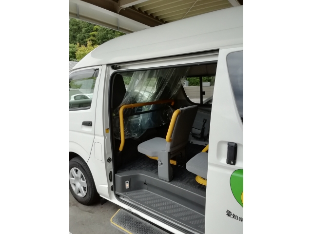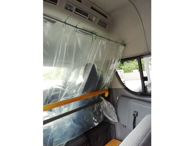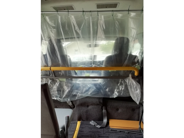 新たなコロナ対策として、飛沫感染を防止するために市販のビニールシートを利用して公用車内に仕切りカーテンを設置しました。車内はまさに3密の空間になりとても危険な状態です。まだまだ気を緩めることなく、皆様が安心してご利用できるよう意識を高く持って対策に努めていきます。