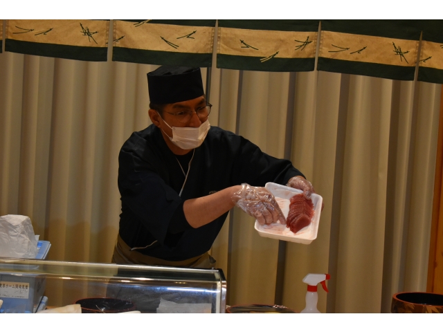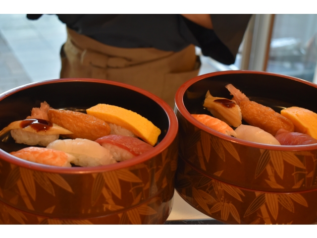 まずはお寿司編です。職人さんがお寿司を握っているところを見学しました。お昼ご飯に桶のお寿司を頂きました。