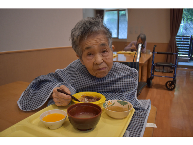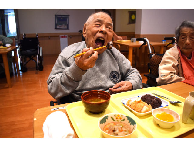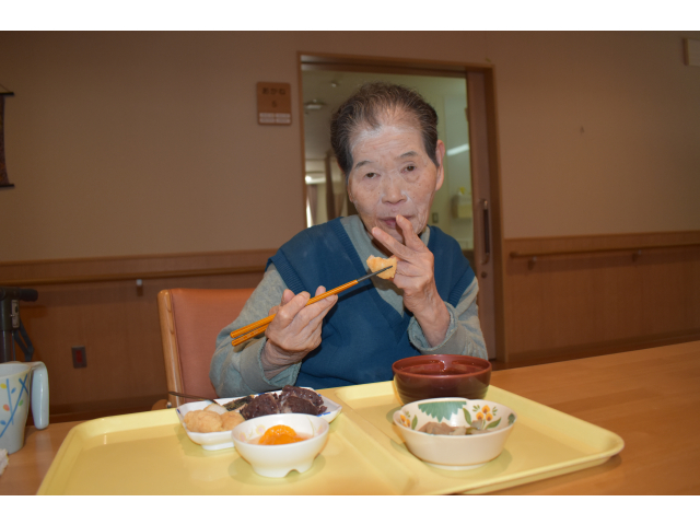 岡崎苑では、春と秋のお彼岸の時期に「おはぎ」を提供しています。今回も食事の形態に合わせた4種類を準備しました。何か月も前から「おはぎはいつ出るの?」と楽しみにされている方もみえます。「おいしいよ~」と喜んで食べていただけました。