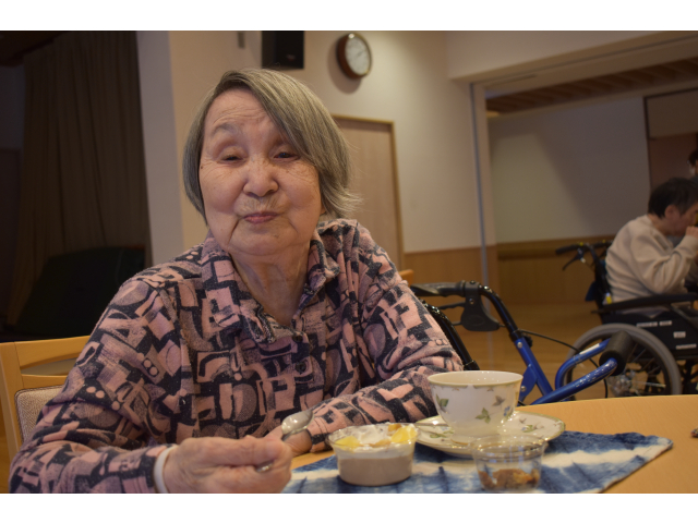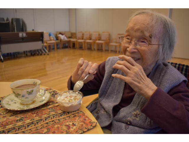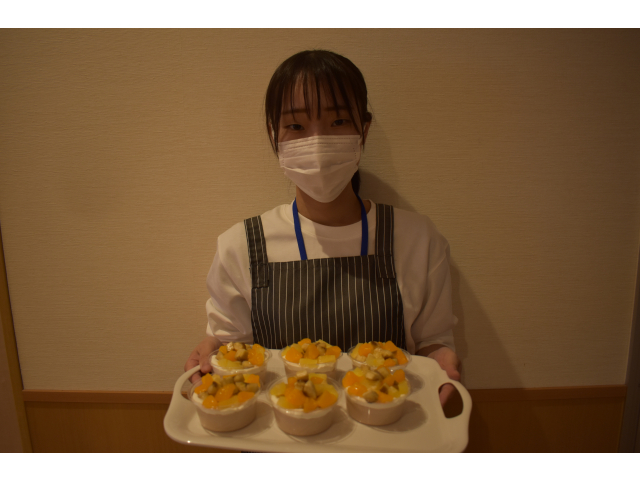 10月の喫茶では、管理栄養士の実習で来ていた学生さんが、手作りの「フルーツショコラムース」を作ってくれました。見た目もかわいらしく、やさしい甘さが好評でした。また、いもやかぼちゃの秋らしいメニューもあり、入居者の皆さんに喜んでいただけました。