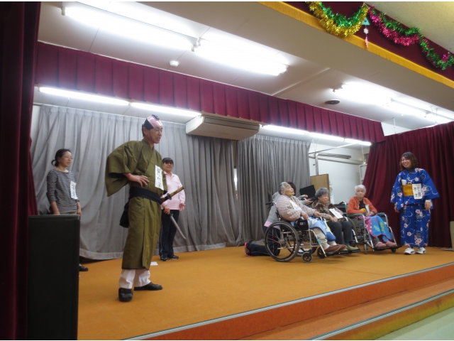 2月12日(水)に佐屋苑職員による佐屋劇団の「水戸黄門風」の劇が開催されました。利用者の方の協力も得ながら黄門様、助さん、格さんが悪代官を懲らしめてくれました。佐屋苑に到着した一行は職員や利用者の皆さんと劇を熱演!楽しいひと時に、皆さん大笑いでした。
