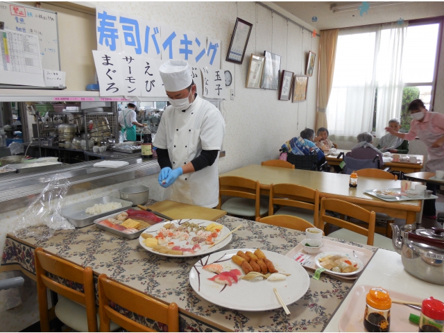 3月26日(水)に握りずしバイキングを開催しました。厨房の調理師さんは前日から準備に大忙し。当日も沢山握って大活躍でした。今日はいつにも増して利用者の皆様はお替りをして、沢山召し上がりました。食の楽しみが少しでも多く増えていくと良いと思います。また、ぜひ開催していきたいと思っております。
