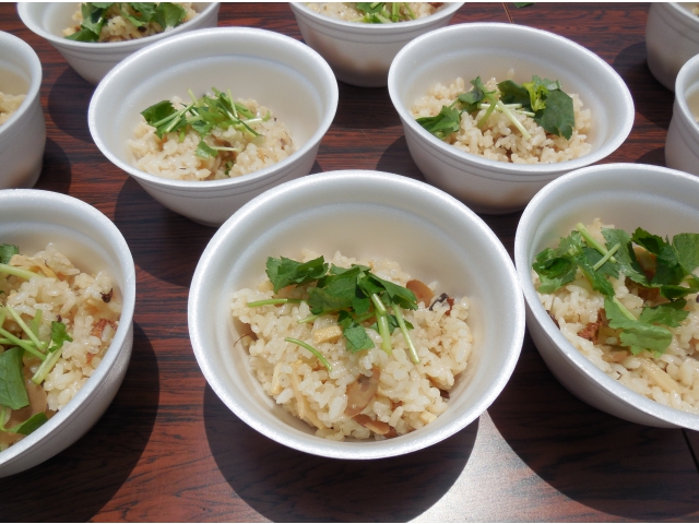 当日は、セットおかず(コロッケや焼売など)、どて煮、炊き込みご飯、デザート(羊羹)、かき玉汁、各種飲み物、ポップコーンの模擬店が並びました。