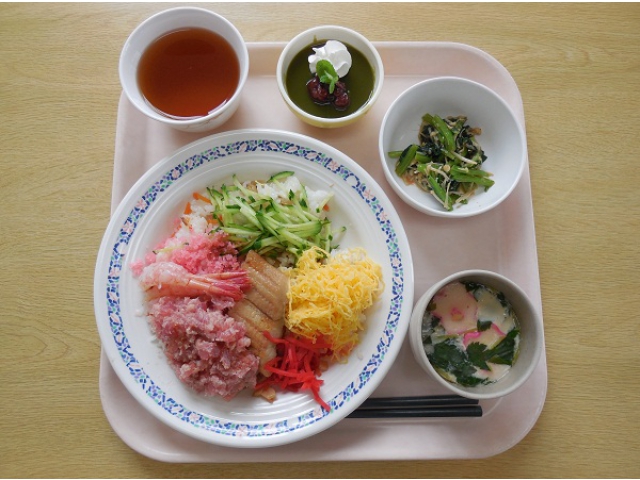 10月9日に誕生会を行いました。今月の誕生会のお食事はちらし寿司、茶碗蒸し、小松菜ごま和え、手作り抹茶水ようかんです。今月もすべて調理師の手作りで、特に茶碗蒸しは腕の見せ所。絶妙な火加減でとってもおいしく出来上がりました☆ 利用者の皆様もお寿司、茶碗蒸しと聞くととても喜んでくださり、いつも以上にたくさん食べていただけました。