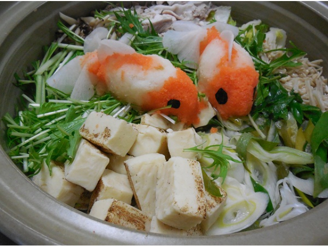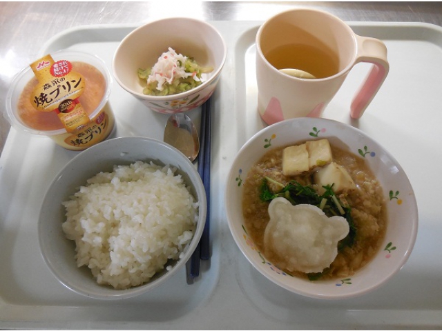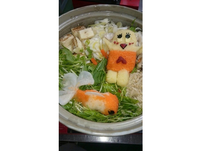 12月17日の昼食は皆で鍋を囲みました。第1弾は「みぞれ鍋」!でも、ただのみぞれ鍋ではありません。今回は調理師、栄養士総出で大根おろしアートに挑戦(8分音符)鍋の中にかわいらしいクマ、ネコ、アザラシたちが登場しました。
