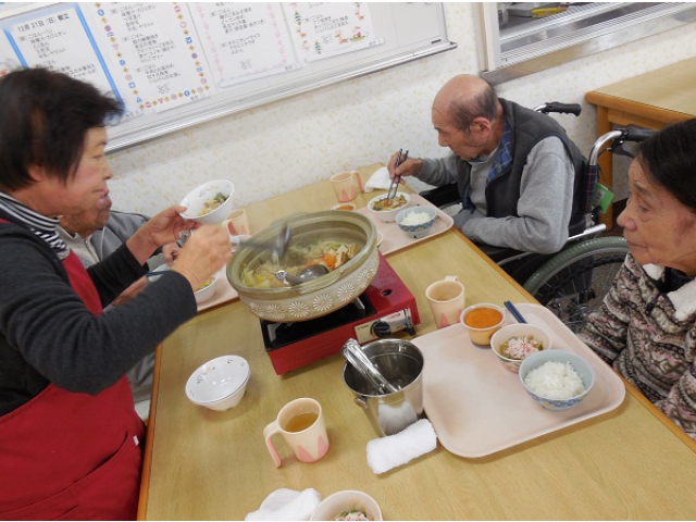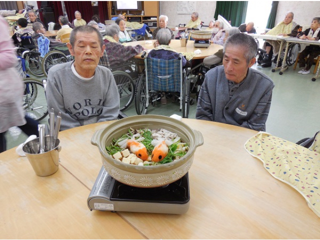 鍋をテーブルに運ぶと利用者の皆様だけでなく、ボランティアさん、職員からも大歓声☆崩してしまうのがもったいないくらいでしたが、味の染みたおいいしい鍋を皆様たくさんおかわりしてくださり、普段とは違う「みぞれ鍋」を楽しんでいただけました☆