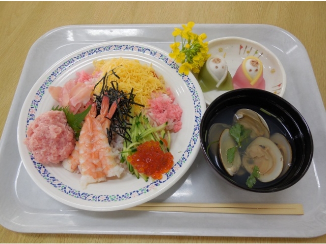 食事はちらし寿司、潮汁、まんじゅうでした。酢飯には桜の塩漬けが混ざっていて、全体的にピンク色でかわいらしい雰囲気にまとまりました。まんじゅうはお内裏様とお雛様の2種類を用意し、「かわいいね」とご好評でした。利用者の皆様にはたくさん召し上がっていただき、ひな祭りを楽しんでいただきました。