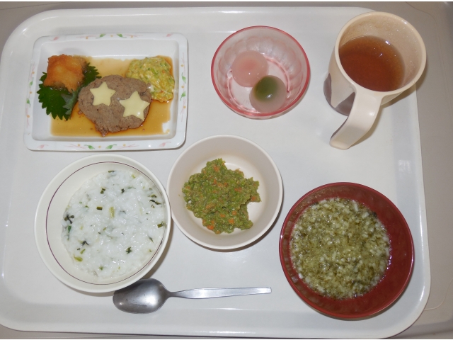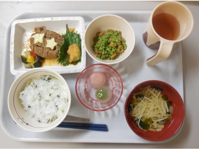 7月7日は七夕でした。佐屋苑では七夕食として菜めし・流れ星ハンバーグ・十六ささげのごまみそ和え・そうめん汁・水まんじゅうを提供しました。