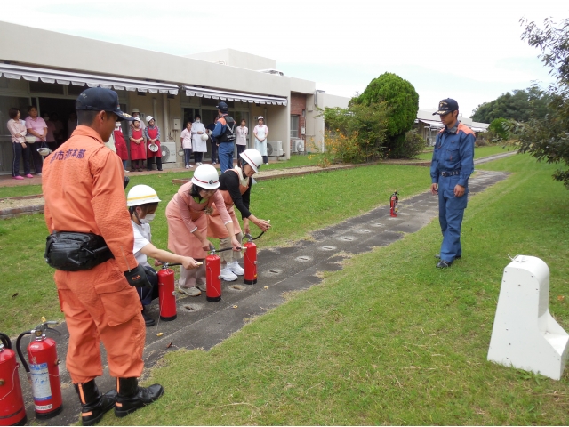 施設内での火災発生とともに利用者様を外へ避難誘導し、その後、愛西市消防本部の皆様の指導の下、消火器を実際に使用し訓練を行いました。