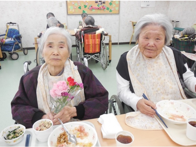 11月10日に誕生会を行いました。今月の誕生会のお食事は、利用者様のリクエストによりちらし寿司、茶碗蒸し(ゆりね)、ほうれん草のお浸し、お饅頭でした。