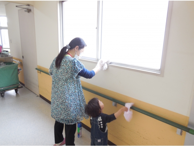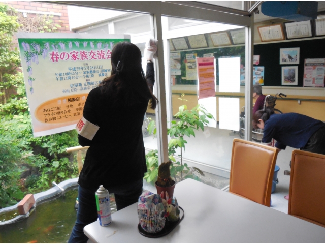 5月25日(木)、佐屋中学校PTAの皆様15名が、施設内の窓清掃にお越し下さいました。 綺麗になっていく窓から外の景色が広がり、利用者様の顔にも素敵な笑顔が・・・。また、お花の寄せ植えもいただき、早速ロビーに飾らせていただきました。外は生憎の雨模様でしたが、お花と利用者様の笑顔で施設内は100%の晴天でした! 佐屋中学校のPTAの皆様、今日は本当にありがとうございました。