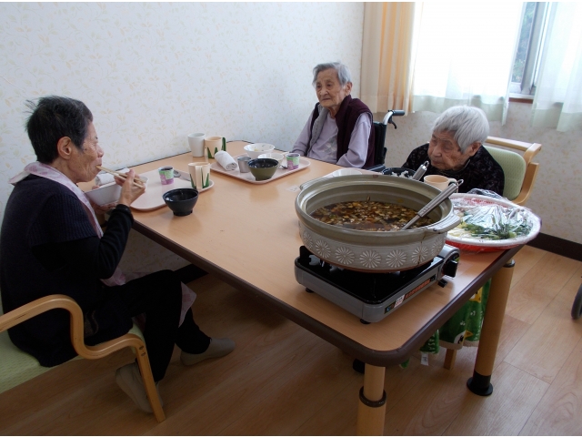 当日は気温が低く、寒かったので、身体の芯から温まる鍋を食べるにはぴったりの日でした。鍋の中でもすき焼き鍋が一番好きという利用者様は多く、「肉もっと入れてちょうだい」「うどんも入っているから美味しいわ」などみなさんとても喜ばれていました。