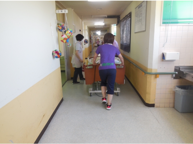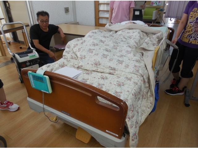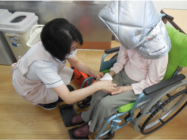 ベッド1名、車いす3名の方を介護員が食堂まで誘導し、ベッドの方は移動式の自家発を使用し、最大限までベッドの高さを上げることができました。1名怪我を負った場合を想定し、看護師が手当しその後の次長への報告もスムーズに行うことが出来ました。