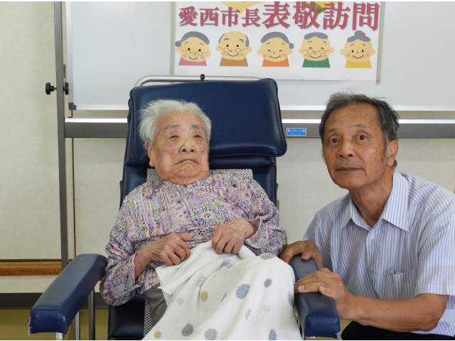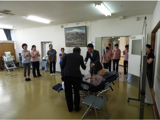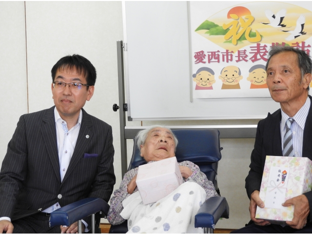 平成30年8月27日(月)、長寿のお祝いに、愛西市長が佐屋苑に来苑されました。佐屋苑の最高齢者はなんと106歳!