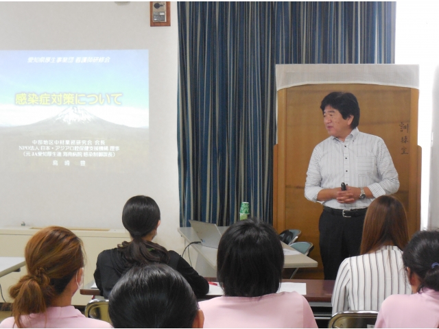 平成30年10月17日に、中部地区中材業務研究会会長・NPO法人日本アジア航空保健支援機構理事の島崎豊氏をお招きし、「感染症の予防と対策」をテーマに職場研修を開催しました。