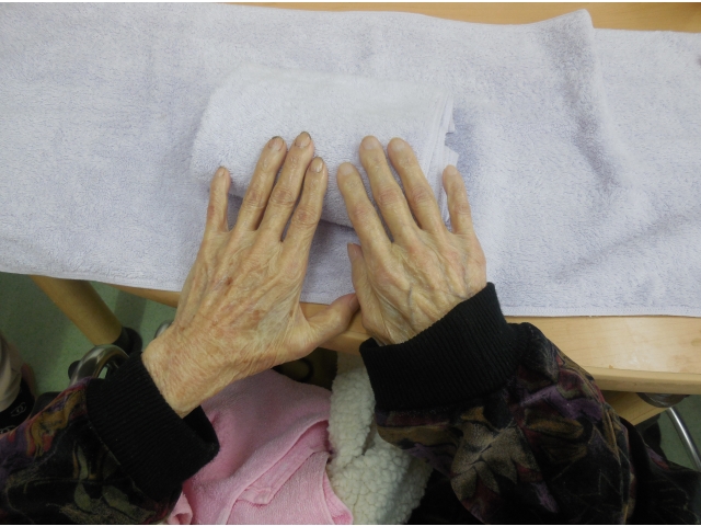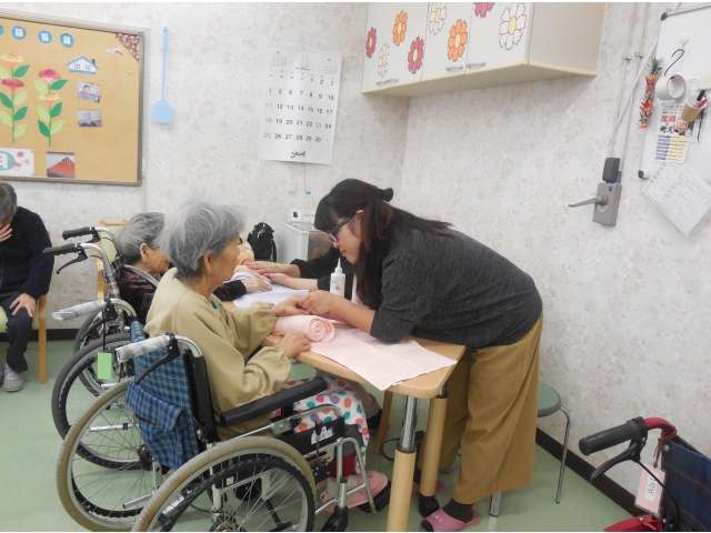 今月からハンドマッサージのボランティアさんに来ていただけるようになりました。利用者さんは、ハンドマッサージで何をされるかわからず、初めのうちは周りで様子を見ていましたが、実際ハンドマッサージをやってもらうと気持ち良いのを実感し、すぐに笑顔になりました。終わった後も、手がしっとりしアロマの香りで利用者や職員も癒されました。来月も来ていただけるので、今から利用者さんは楽しみにしています!