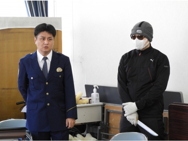 老人ホームにおいては、学校や銀行とは違い、不審者の侵入パターンが読めず難しいとのお話でしたが、とにかく声掛けをし、おかしいと思ったらすぐに110番をするのが良いとのことでした。不審者への対応といえば刺又(さすまた)が有名ですが、使い方を熟知していない人が使うのは、かえって危険なので控えた方が良いとのことでした。