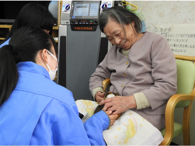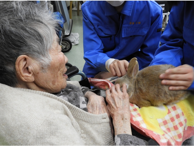 利用者の皆さんは膝に犬やモルモット、フェレット、ウサギ、鶏を乗せてもらい笑顔が溢れます。沢山の動物たちに職員まで笑顔になりました。