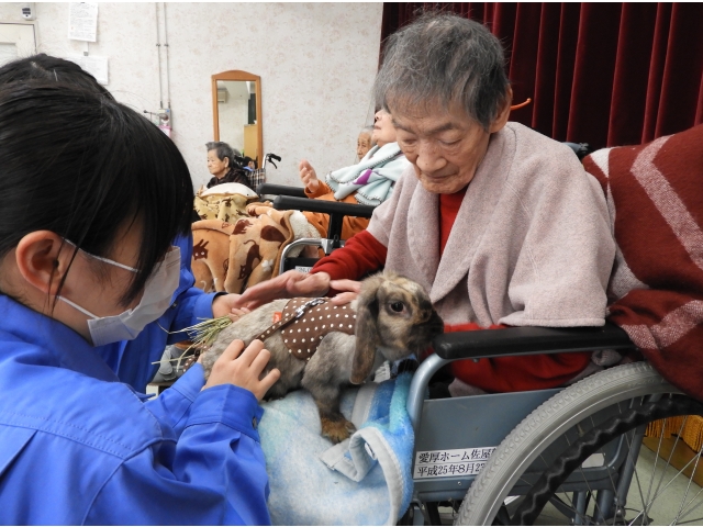 2月7日、佐屋高校のアニマルコースの先生2名と生徒19名による移動動物園の慰問がありました。